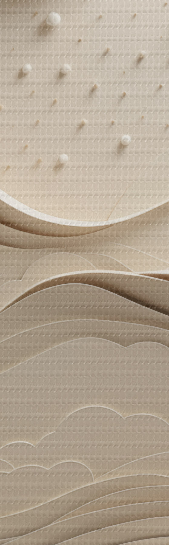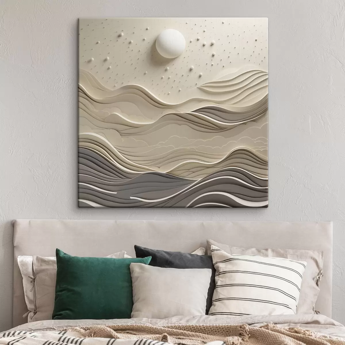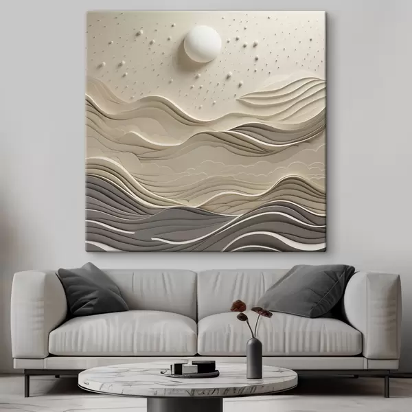 Schilderij Een minimalistisch, gestileerd landschap met glooiende heuvels en een grote maan aan een sterrenhemel, abstracte kunst Art. s48402