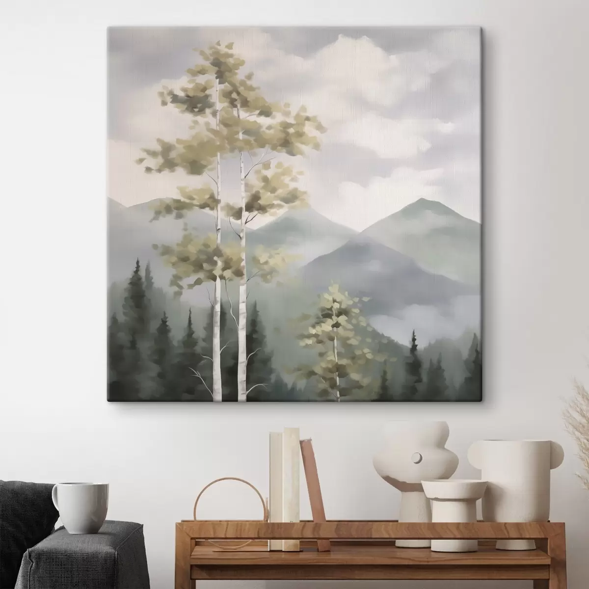 Schilderij Bomen tegen een bergachtige achtergrond, schilderijimitatie Art. s48421