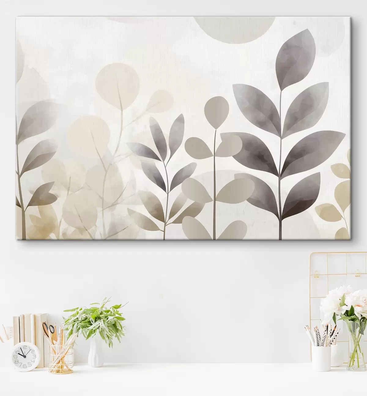 Schilderijen Beige en grijze bladsilhouetten, minimalisme s48487