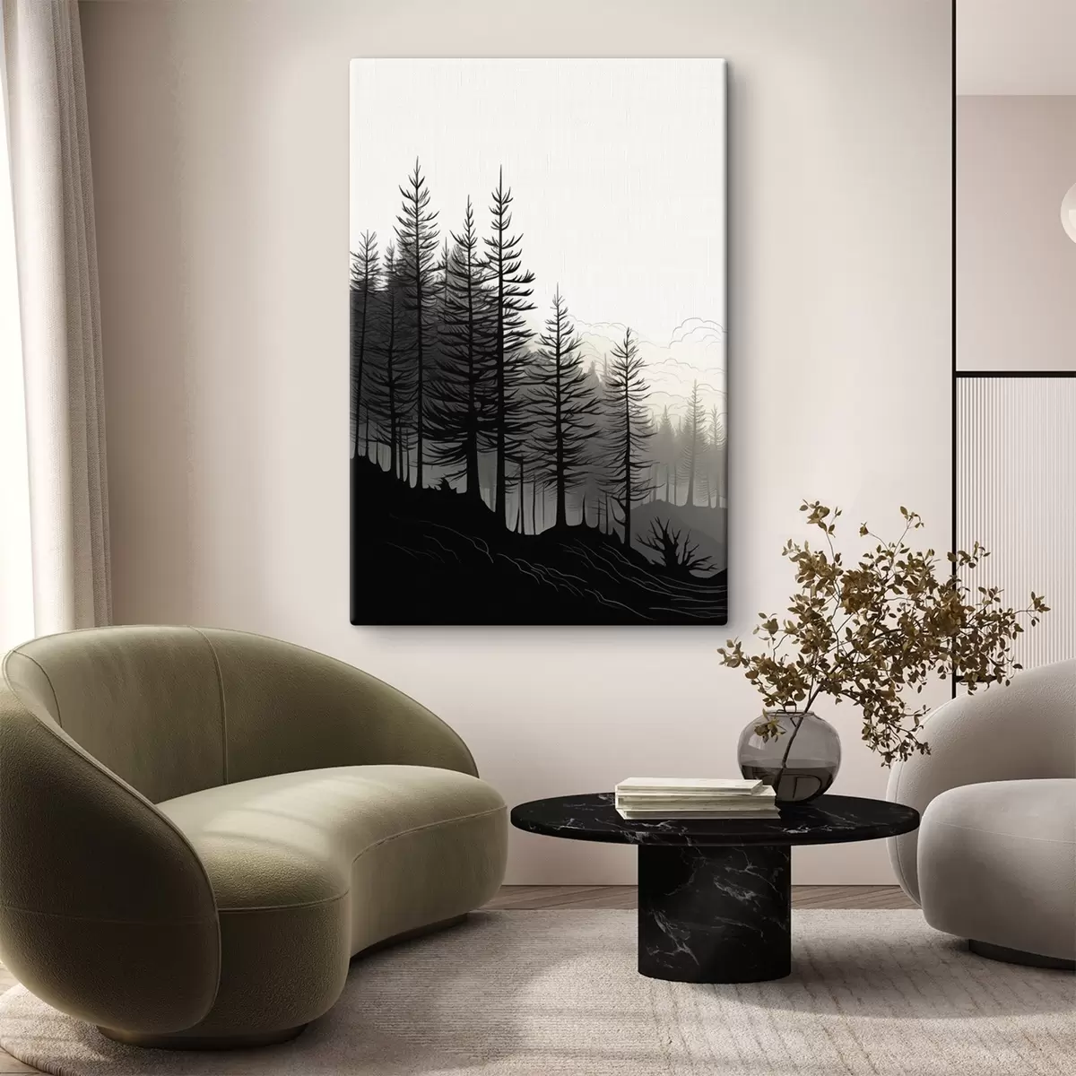 Schilderijen Mistig bos, zwart-wit landschap s48573