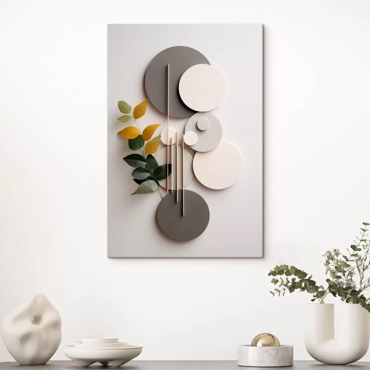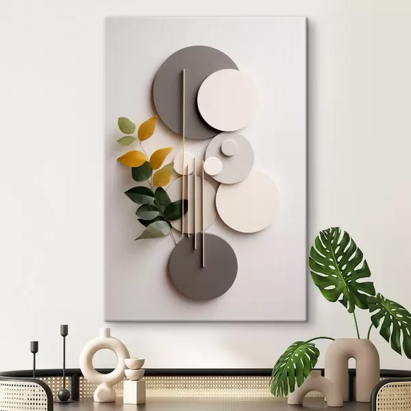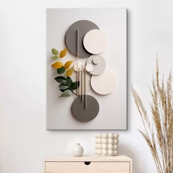 Schilderij Geometrische cirkels met een groene, bladrijke tak Art. s48598
