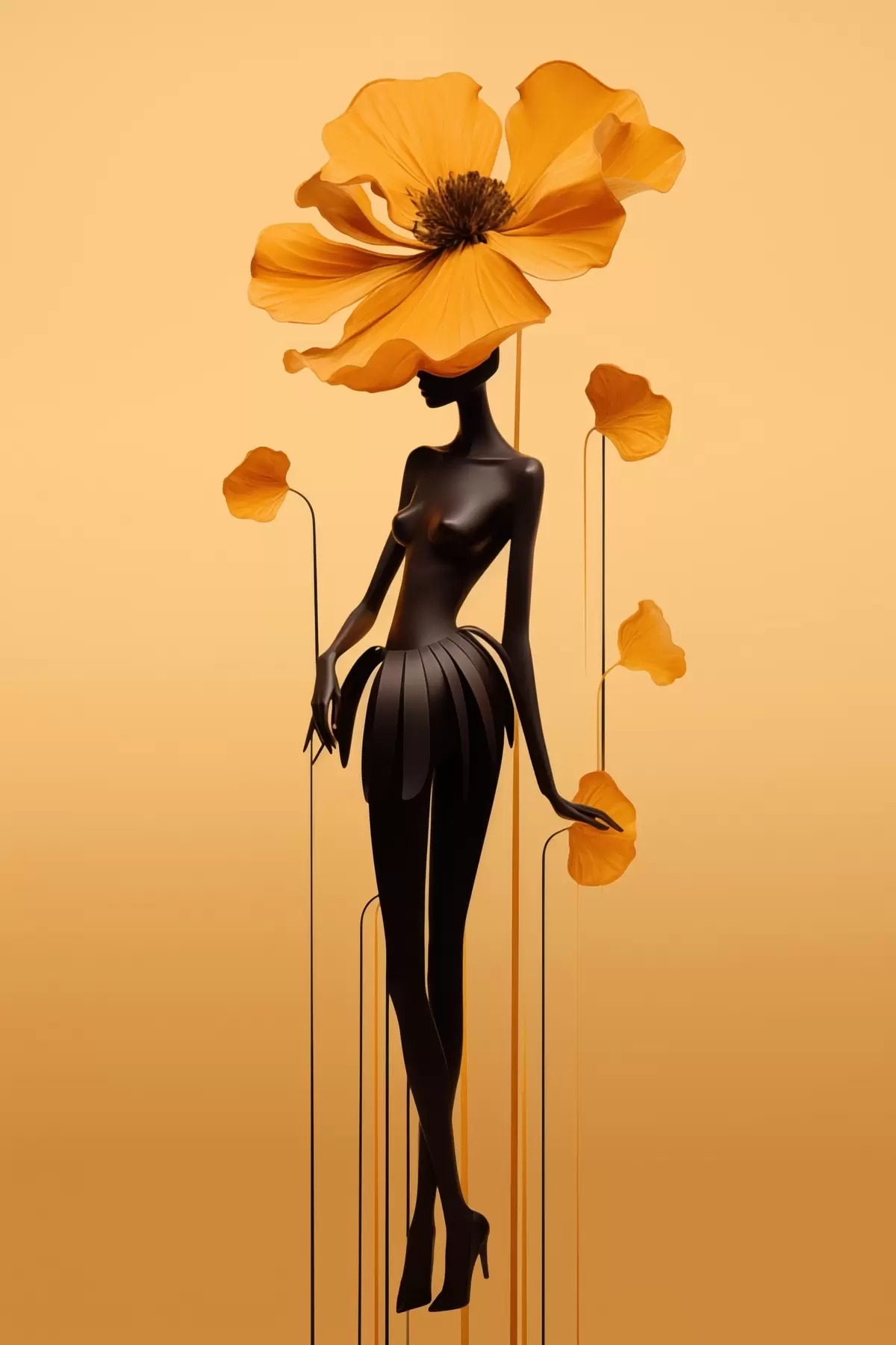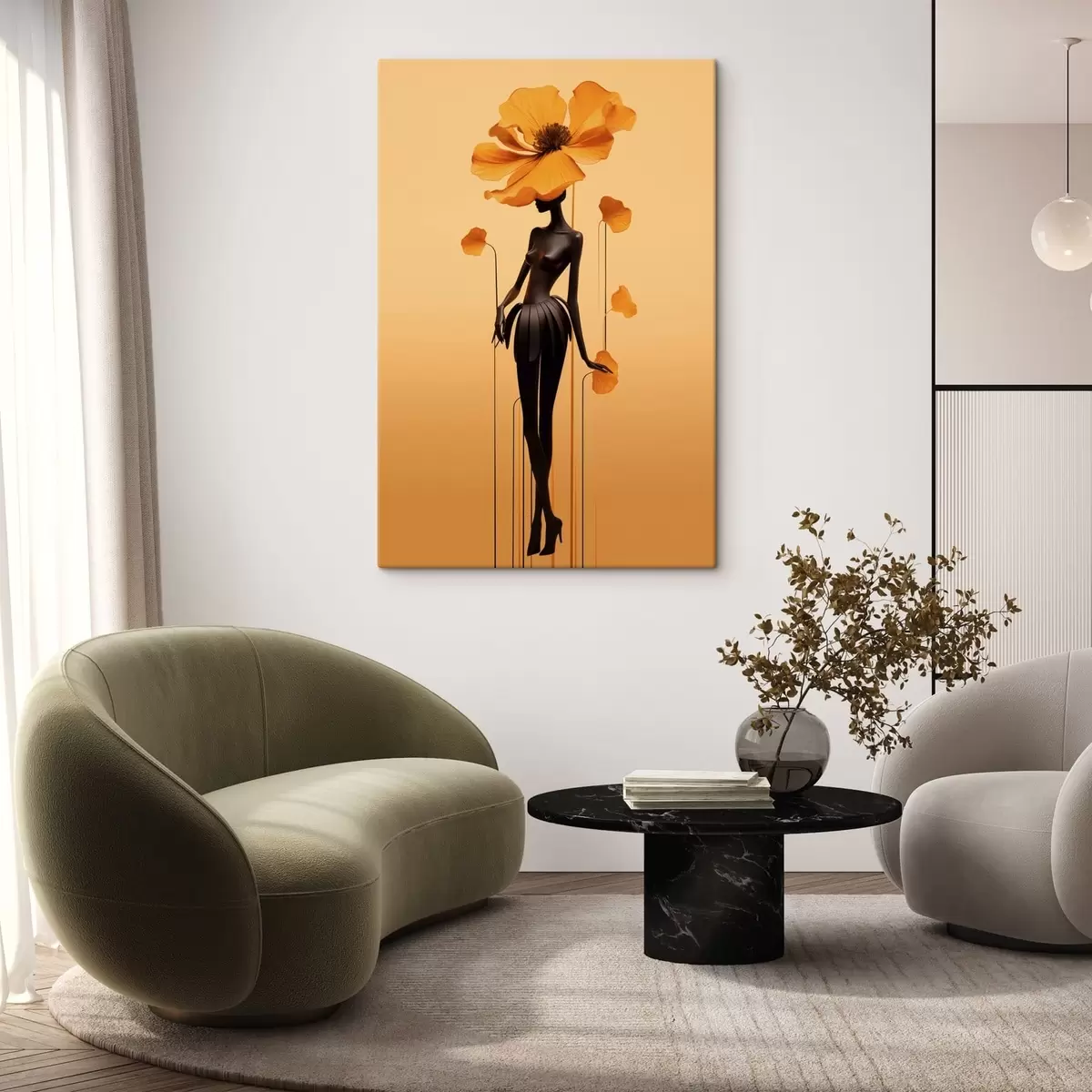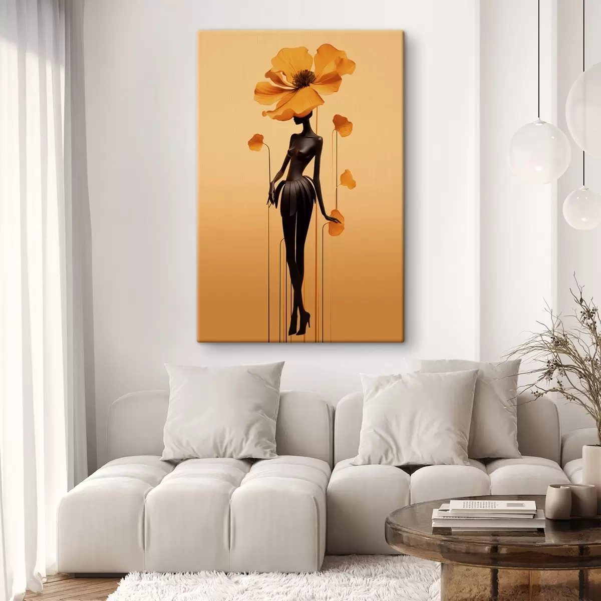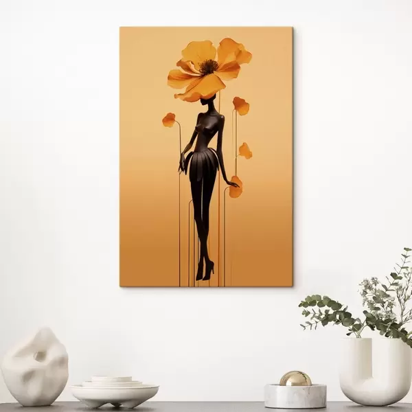 Schilderij Elegant figuur met bloemen tegen een warme achtergrond met kleurverloop Art. s48619