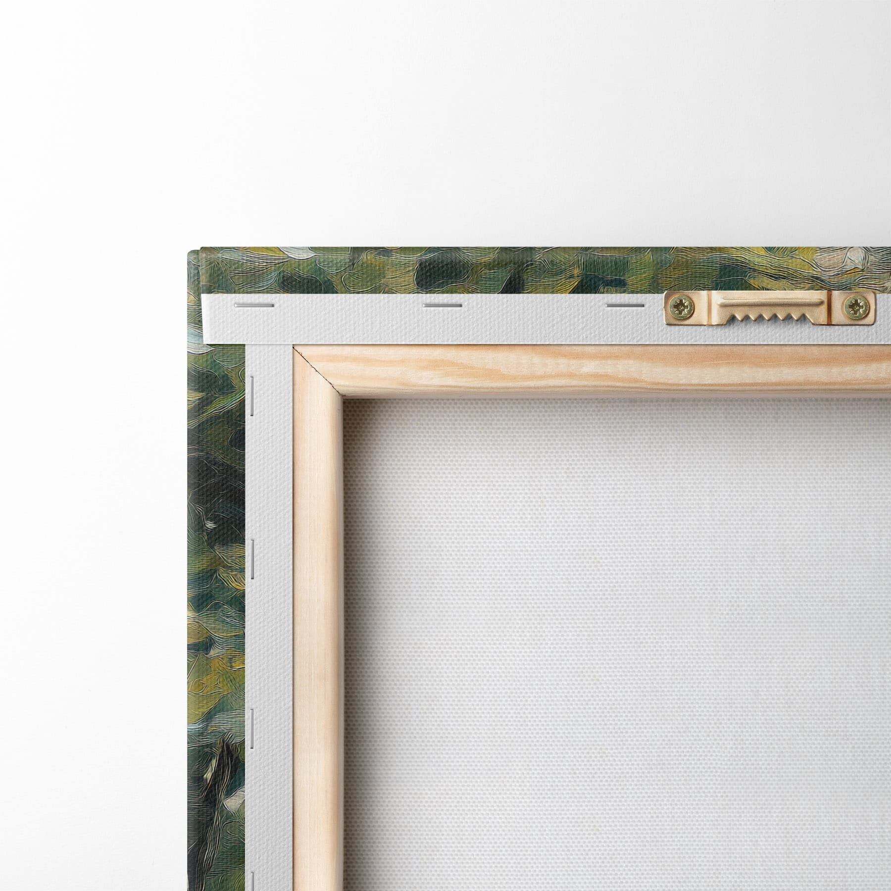 Je kunt het schilderij ophangen aan schroeven. Hiervoor leveren we bevestigingen bij onze foto's, zodat je de foto gemakkelijk kunt ophangen.