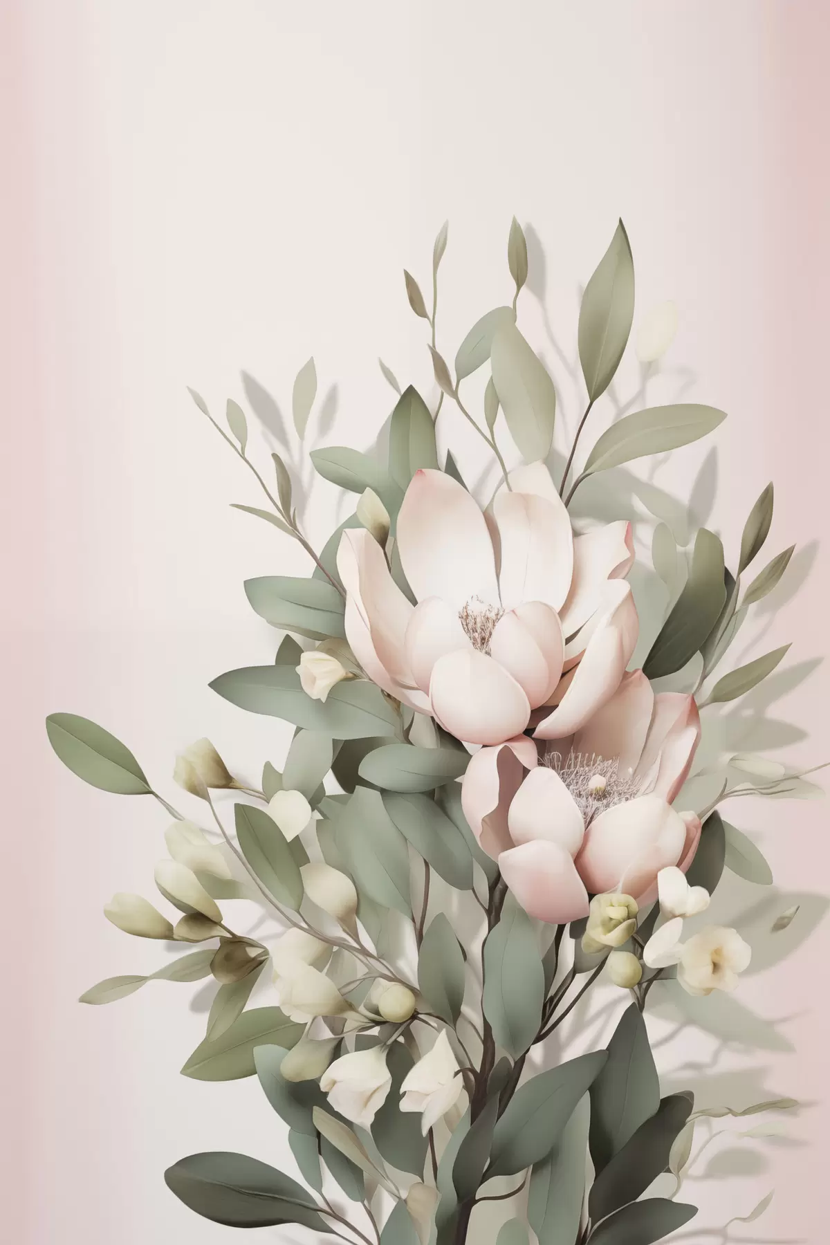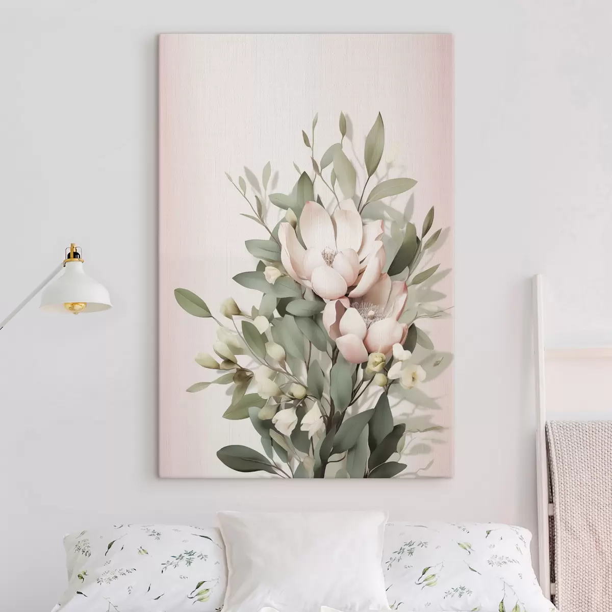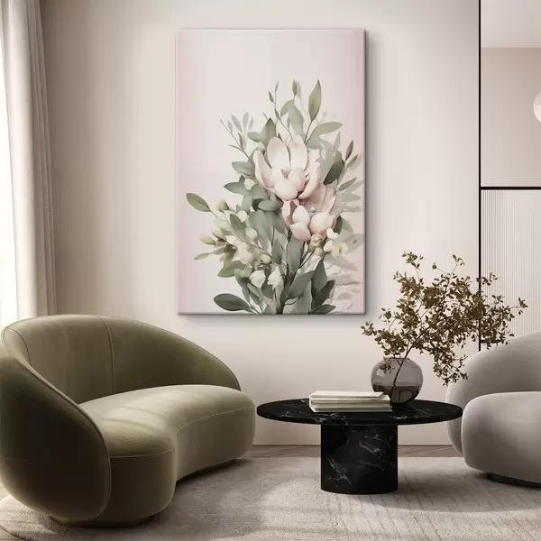 Schilderij Een boeket pastelkleurige bloemen met eucalyptusbladeren, op een lichtroze achtergrond Art. s48728