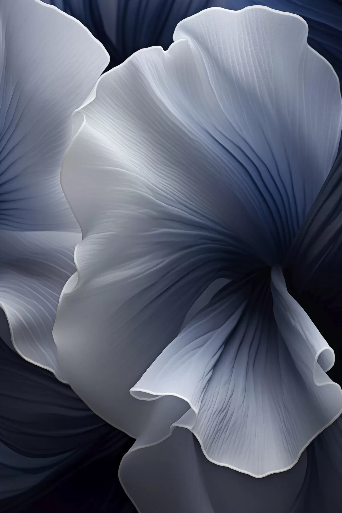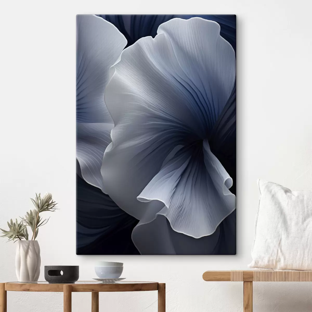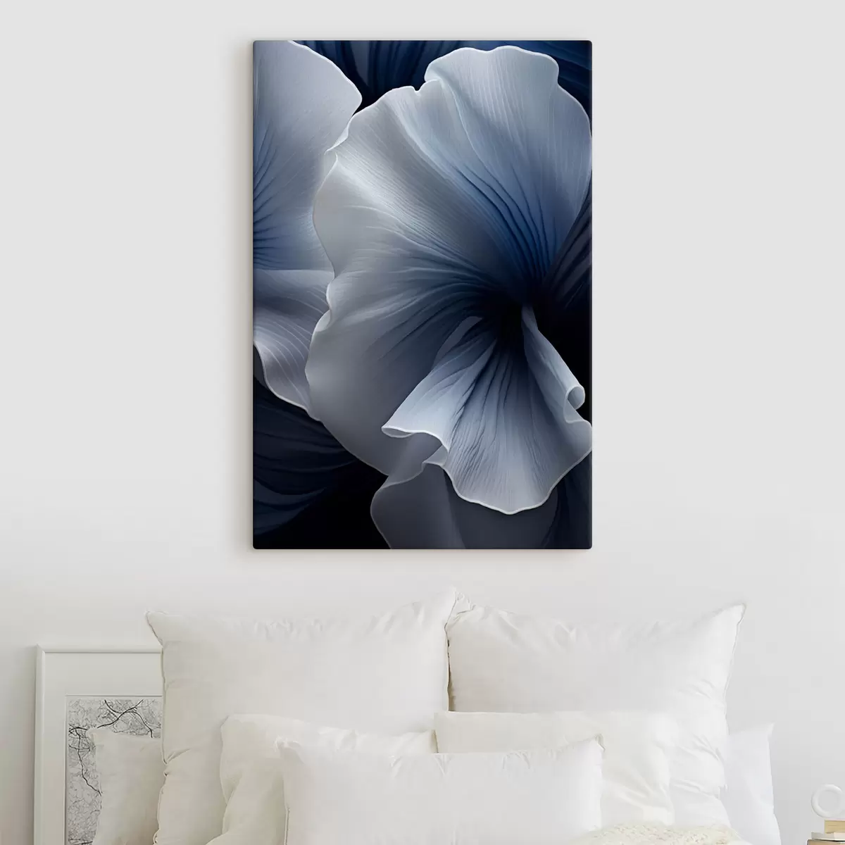 Schilderij Abstracte blauw-witte bloemblaadjes tegen een donkere achtergrond Art. s48731