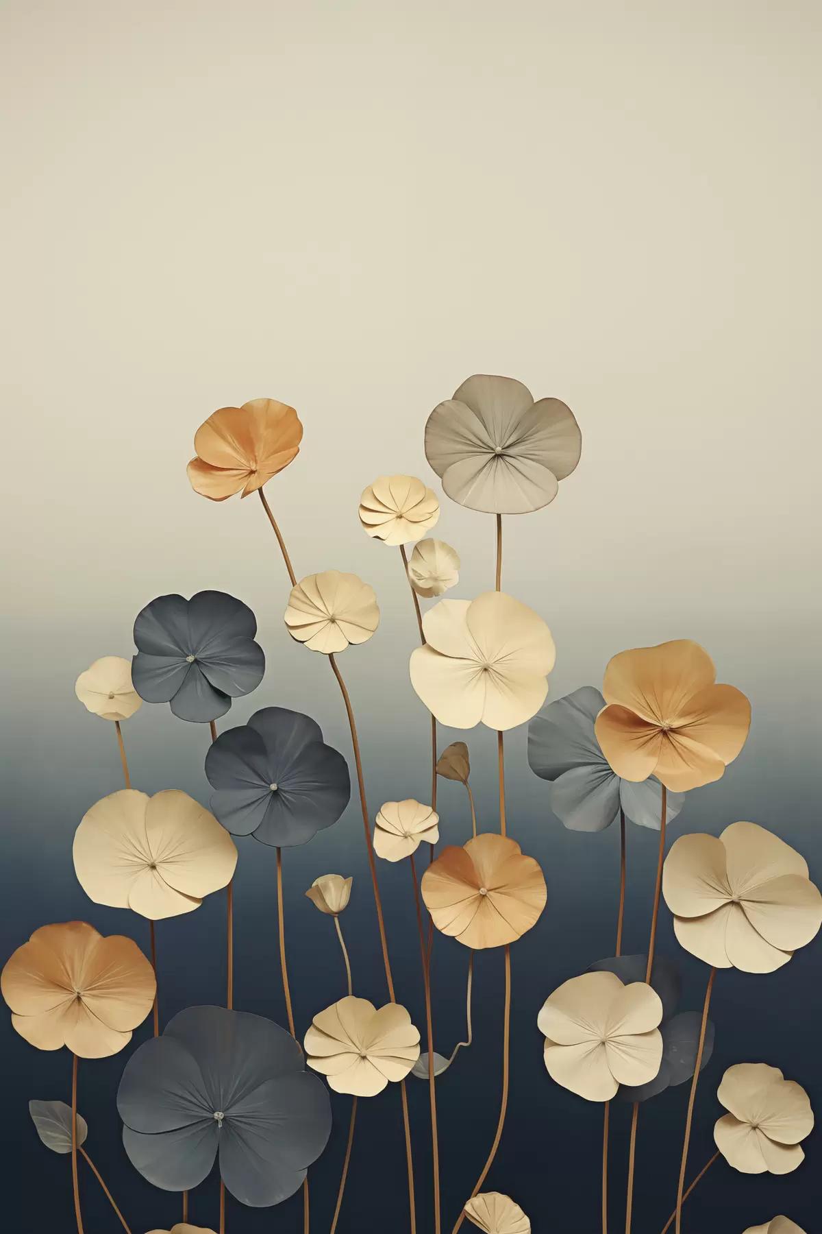 Schilderijen Waterlelieblaadjes tegen een ingetogen achtergrond van beige en donkerblauw s48733