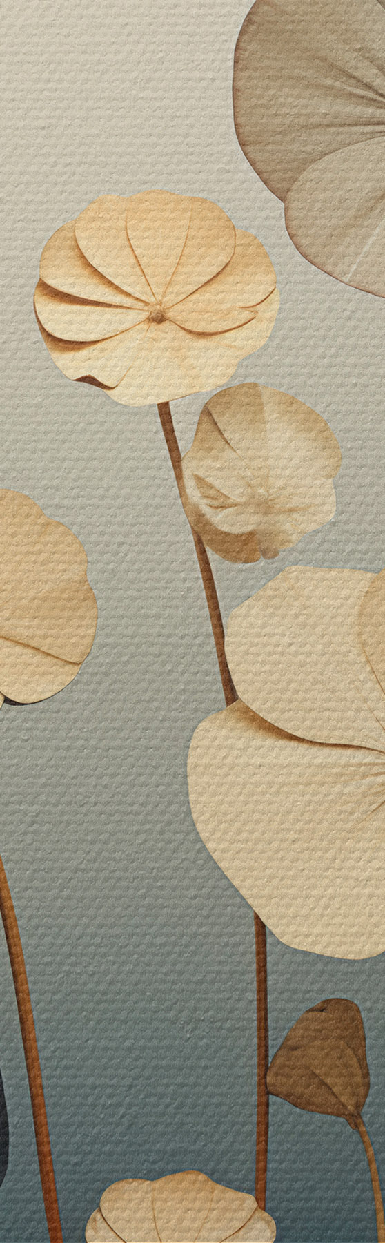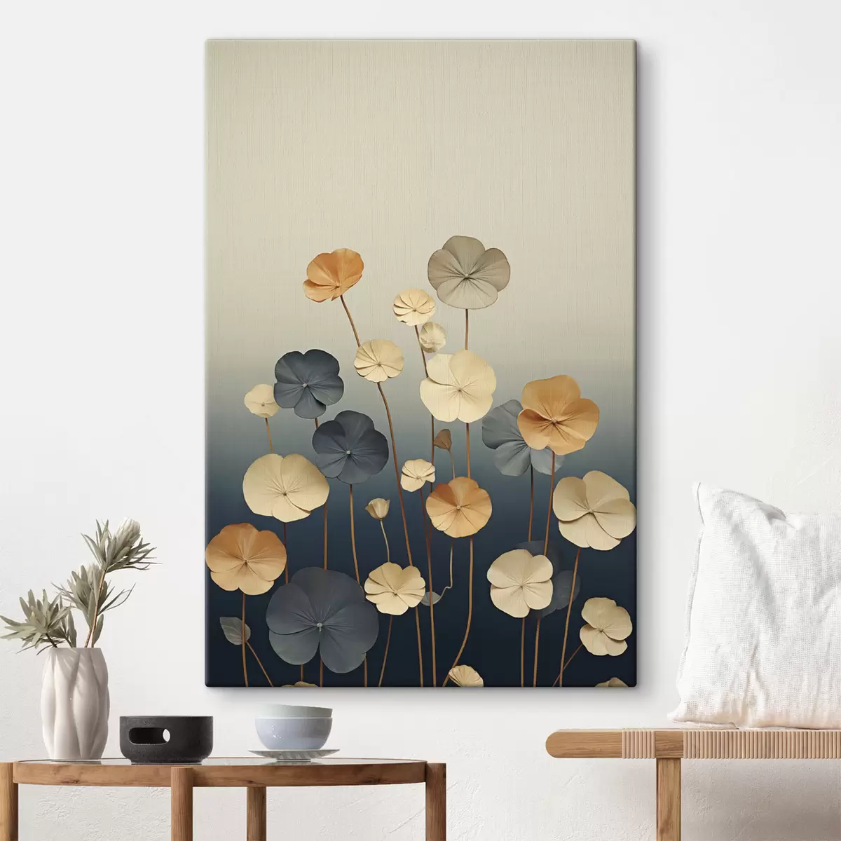 Schilderij Waterlelieblaadjes tegen een ingetogen achtergrond van beige en donkerblauw Art. s48733