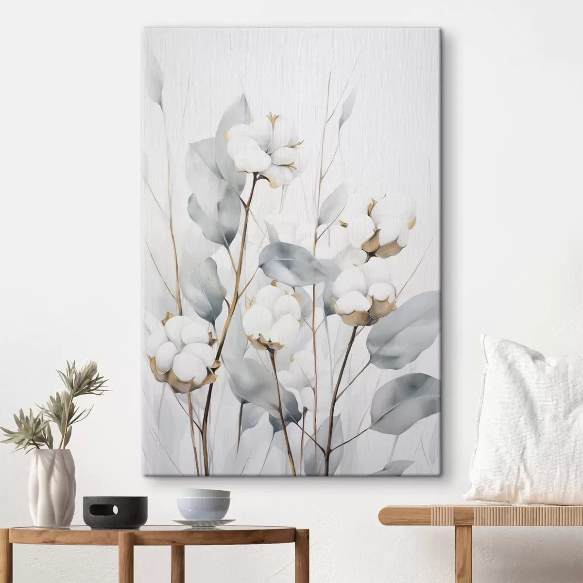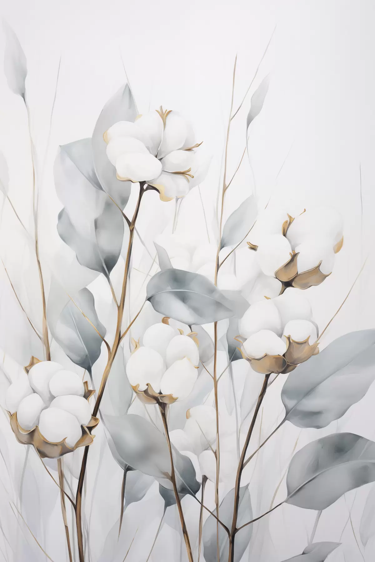 Schilderij Een witte katoenplant met lichtblauwgroene bladeren tegen een lichte achtergrond Art. s48743