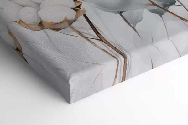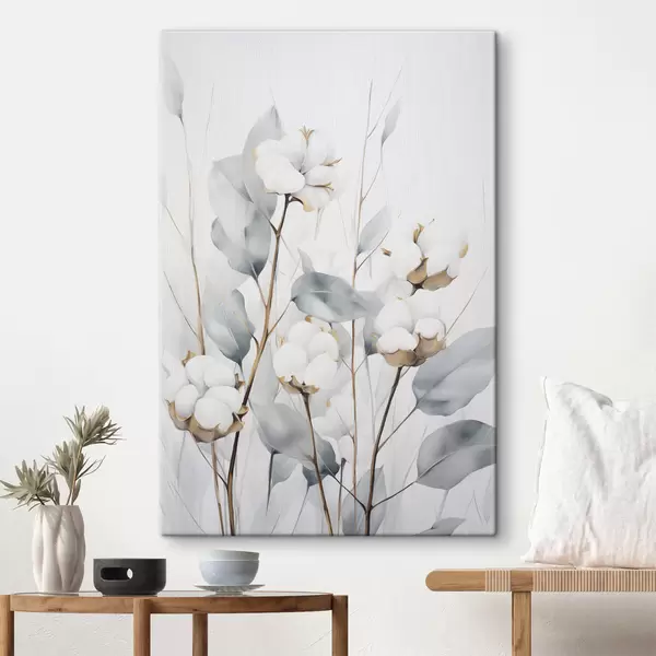 Schilderijen Een witte katoenplant met lichtblauwgroene bladeren tegen een lichte achtergrond s48743