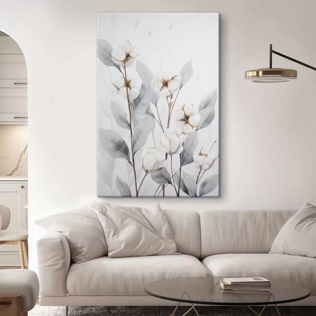 Schilderij Een witte katoenplant met lichtblauwgroene bladeren tegen een lichte achtergrond Art. s48744