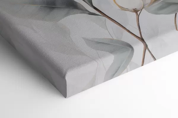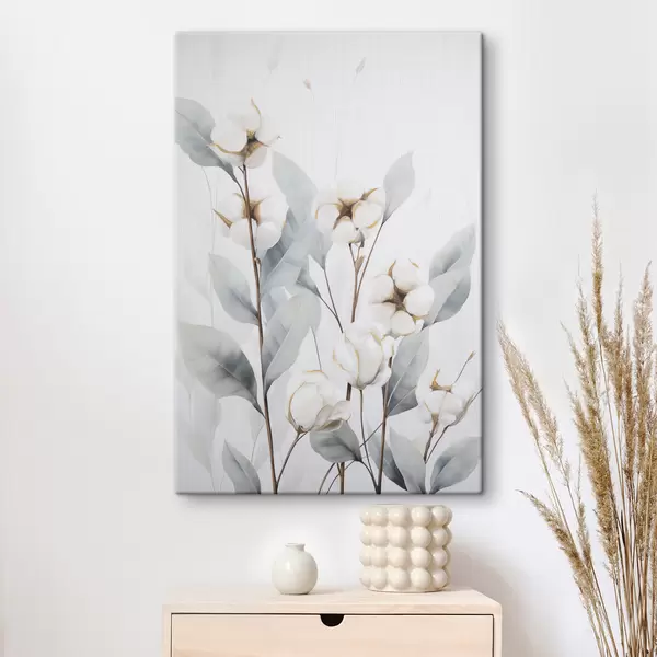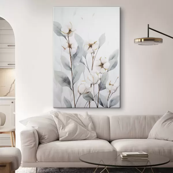 Schilderijen Een witte katoenplant met lichtblauwgroene bladeren tegen een lichte achtergrond s48744
