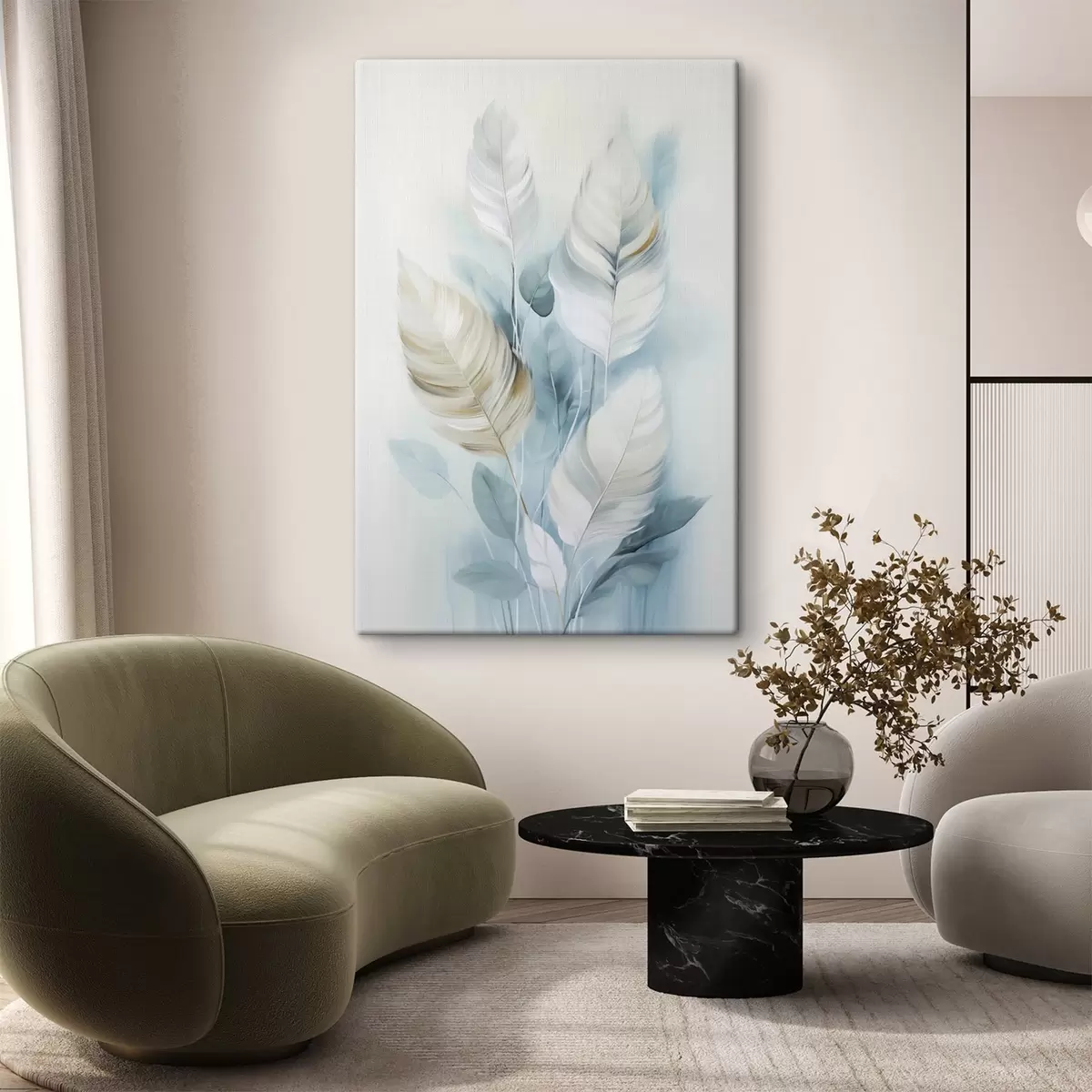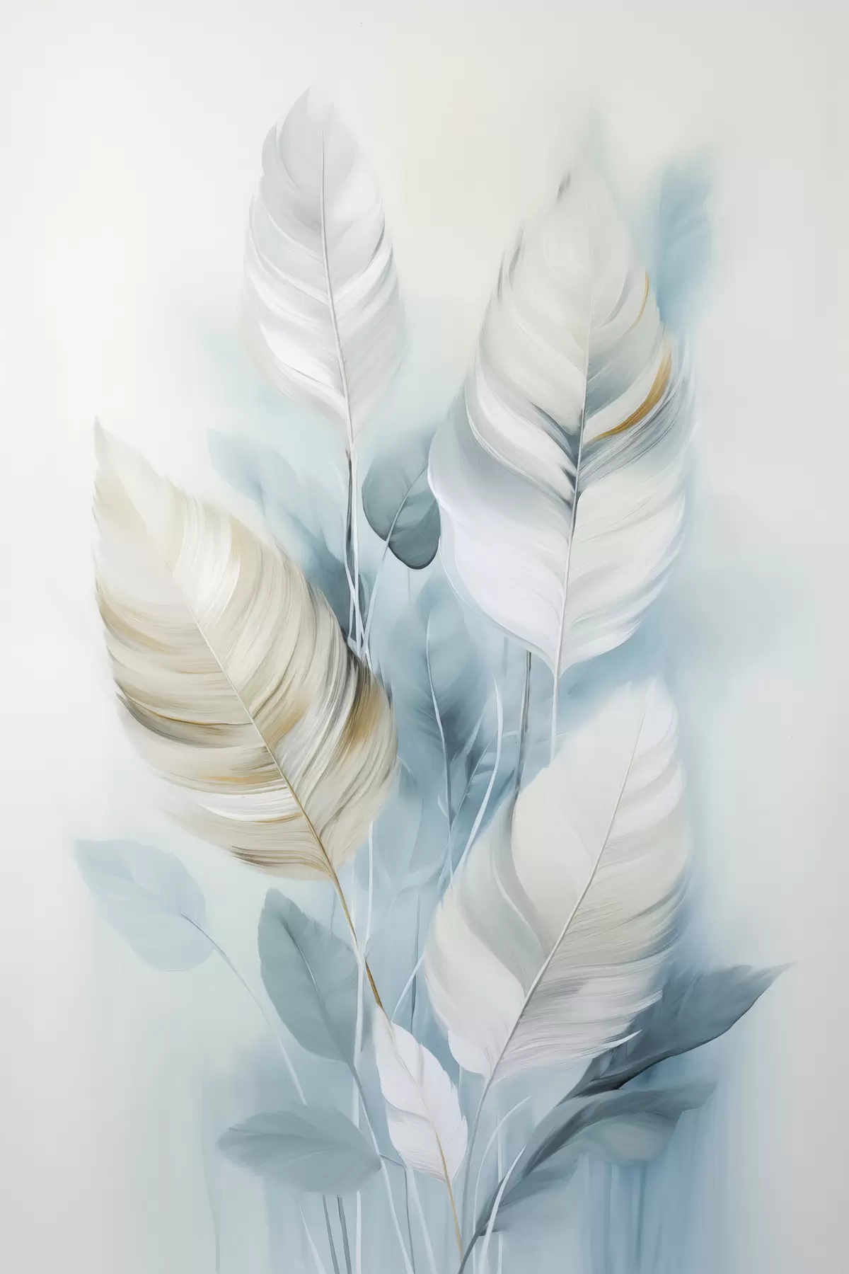 Schilderij Grote, zachte veren in blauw- en wittinten met delicate beige blaadjes Art. s48750