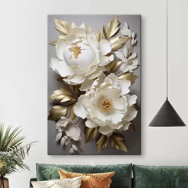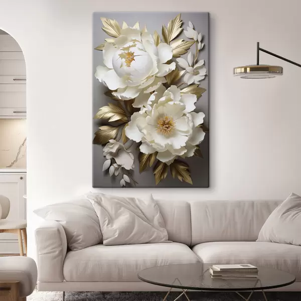 Schilderij Grote witte pioenrozen met gele bladeren tegen een grijze achtergrond Art. s48753