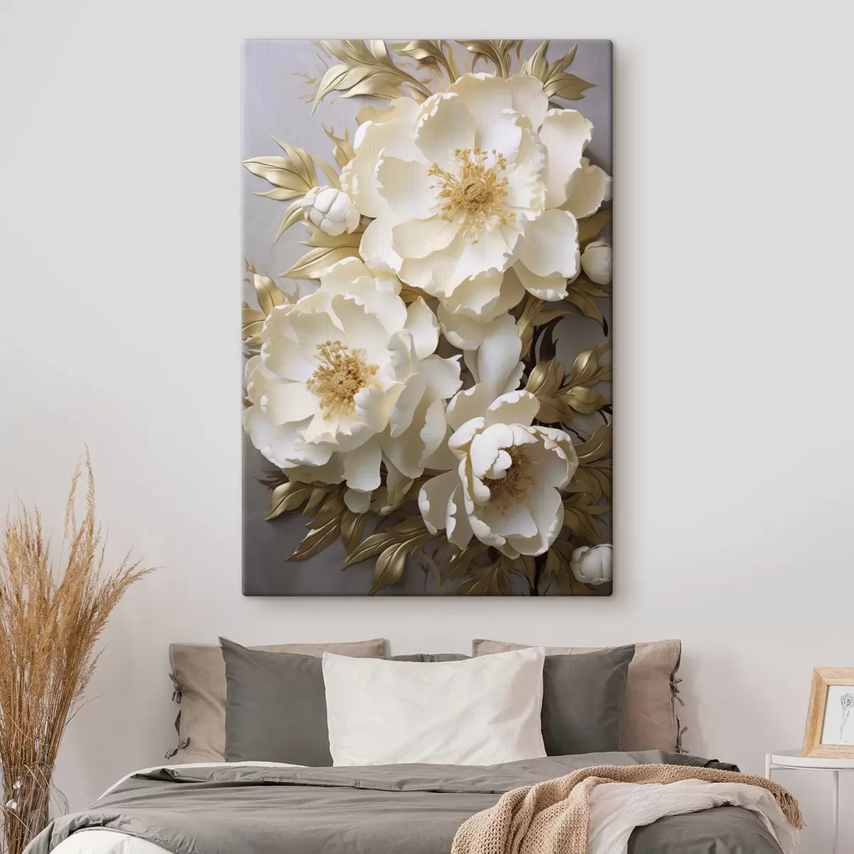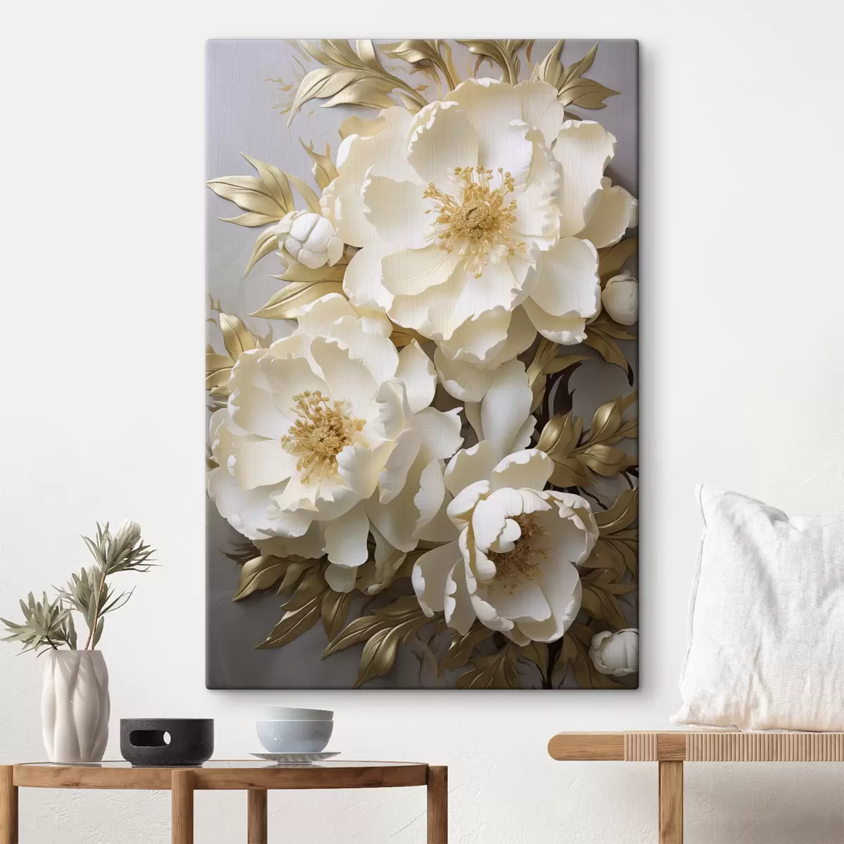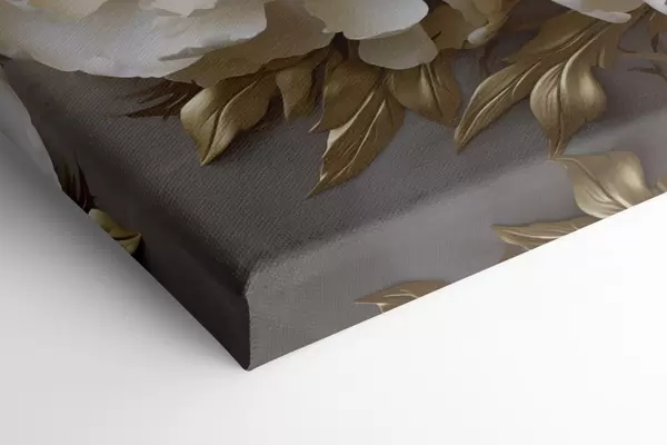 Schilderij Grote witte pioenrozen met gele bladeren tegen een grijze achtergrond Art. s48754