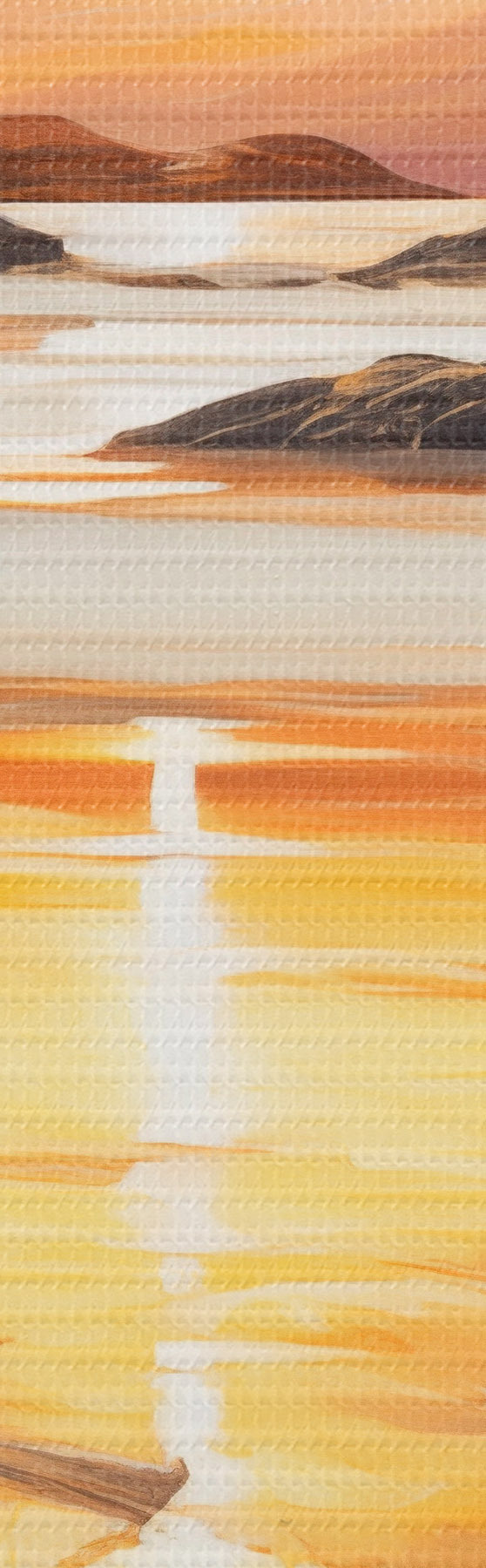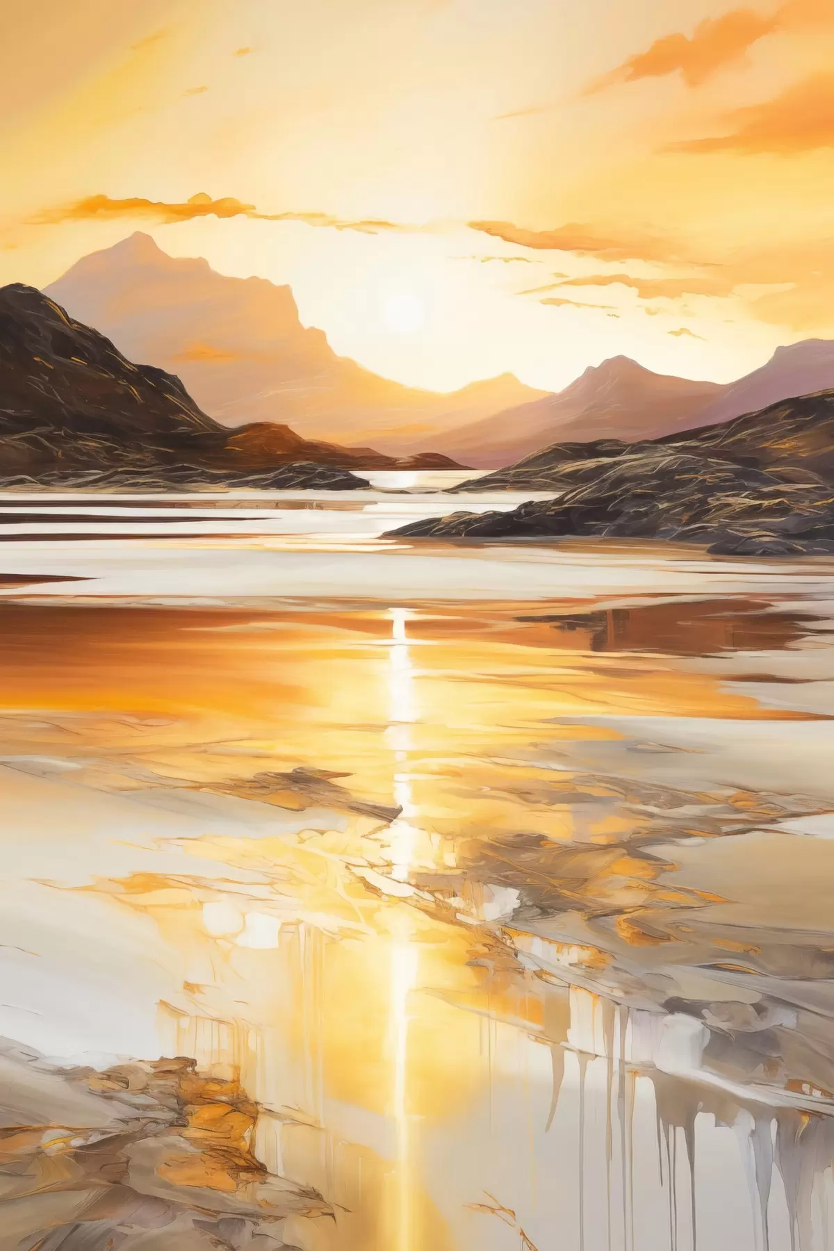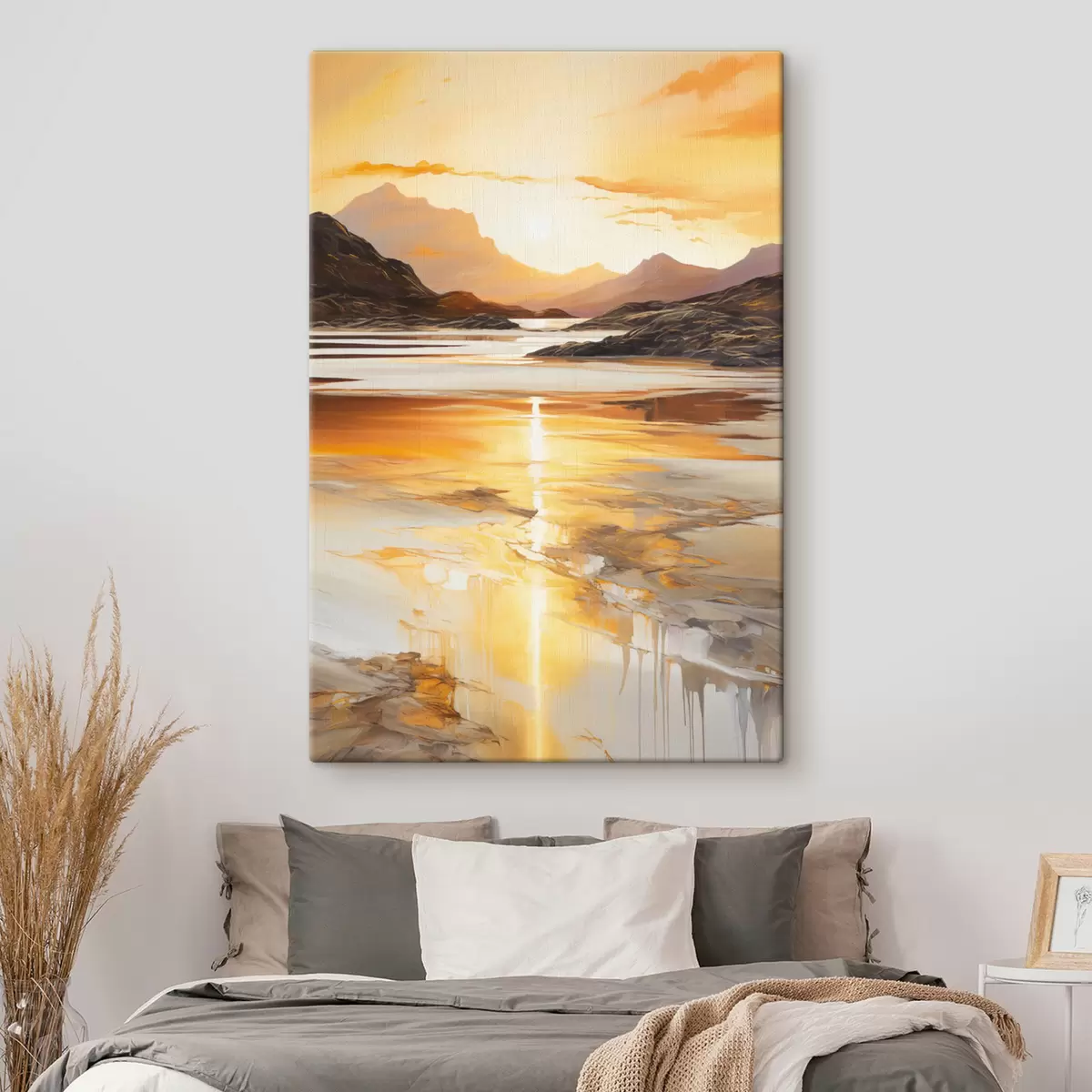 Schilderij Een landschap met een rivier en bergen onder een warme oranje lucht, zonsondergang Art. s48755