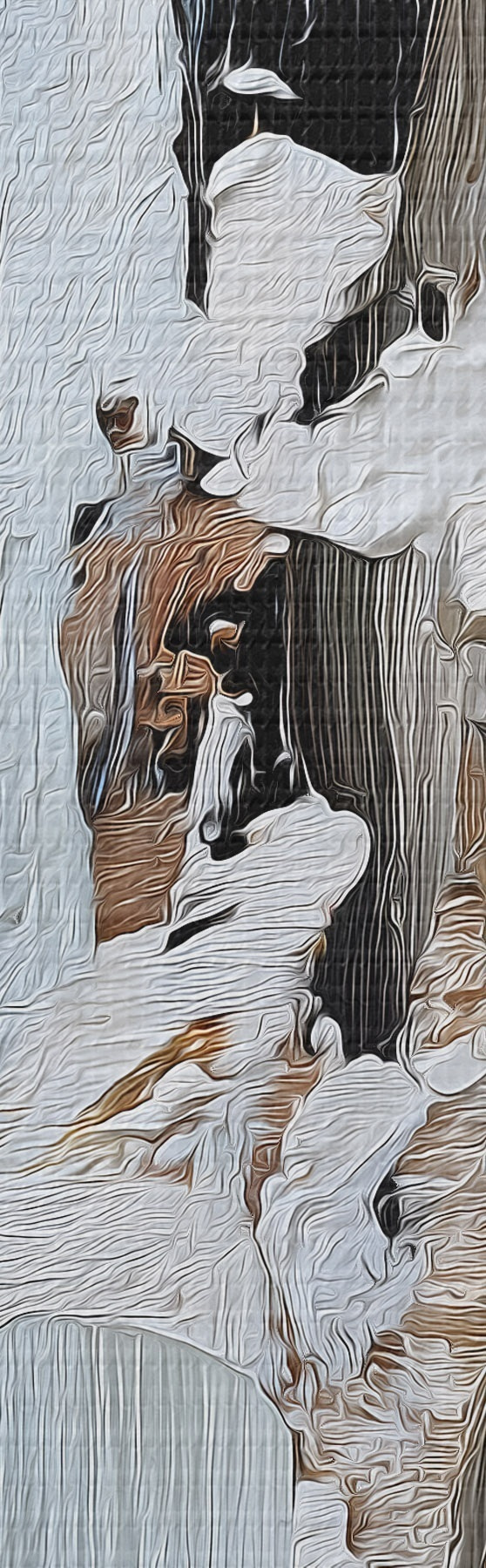 Het schilderij kan voorzichtig worden schoongeveegd met een droge zachte doek of spons; het wordt niet aanbevolen om natte producten te gebruiken. Het gebruik van een vochtige spons is alleen toegestaan als het schilderij gevernist is.