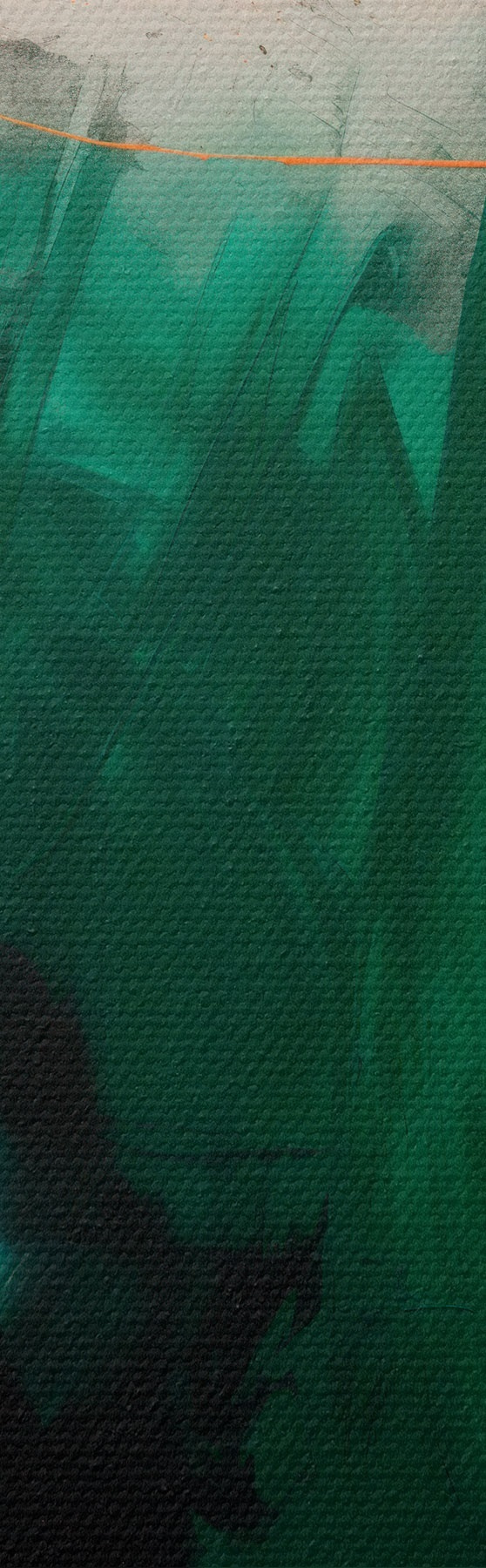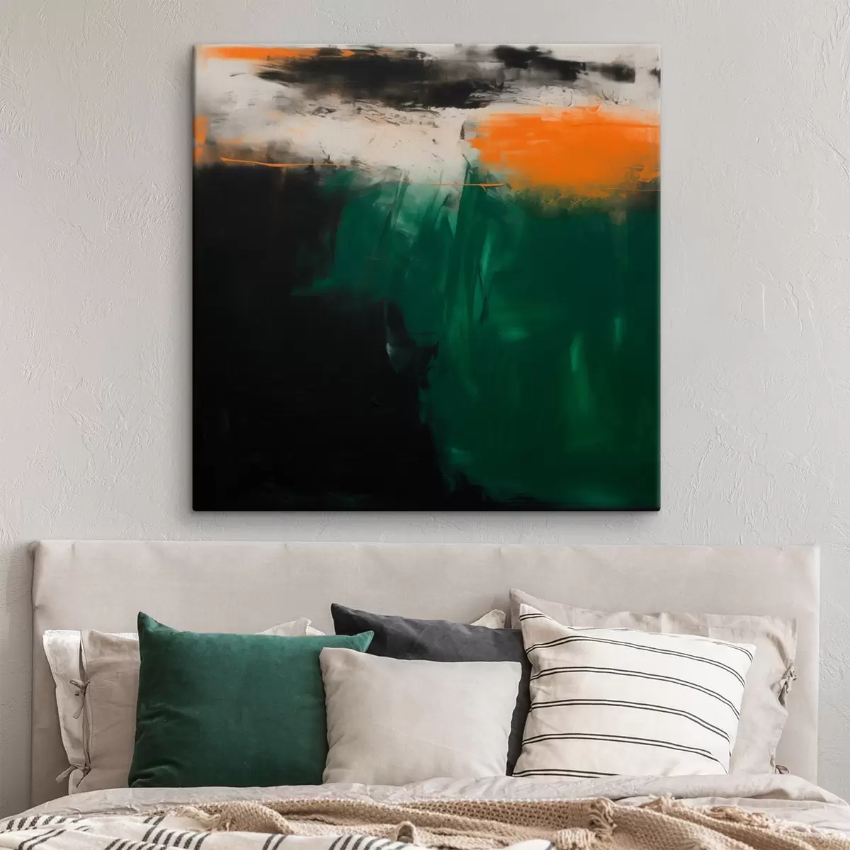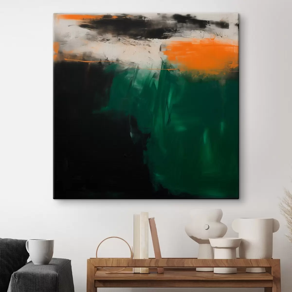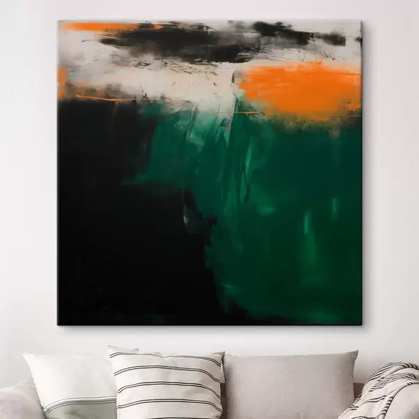 Schilderij Een abstract schilderij met oranje accenten en diepgroene penseelstreken in een eigentijdse stijl Art. s48865